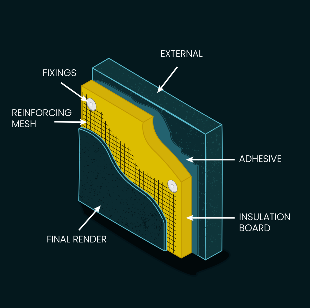 External Wall Insulation (EWI) is a composite cladding system comprised of suitable insulation and waterproof coating which is applied to all the external walls of a building. The application of EWI reduces heating bills, and consequently, carbon emmisions also. External Wall Insulation (EWI) is the most efficient way to insulate an existing solid wall building.